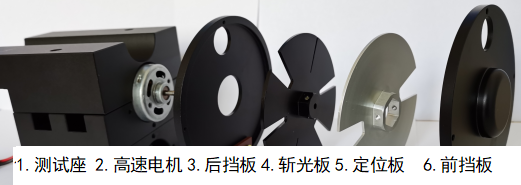 1測(cè)試座、 2高速電機(jī)、3后防護(hù)擋板、4斬光板、5定位板和6前防護(hù)擋板