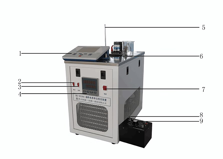 1.電導(dǎo)率儀  2.制冷開關(guān)  3.加熱開關(guān)  4.溫度控制器  5.校準(zhǔn)溫度計  6.燒杯  7.電源開關(guān)  8.TNC接口  9.電導(dǎo)率測定儀標(biāo)準(zhǔn)裝置