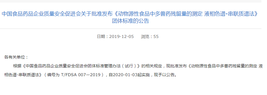 《動(dòng)物源性食品中多獸藥殘留量的測(cè)定 液相色譜-串聯(lián)質(zhì)譜法》團(tuán)體標(biāo)準(zhǔn)公告