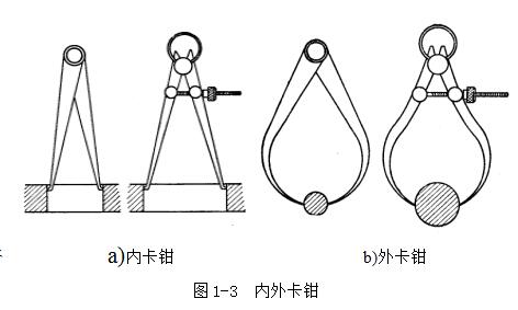 圖1-3是常見的兩種內(nèi)外卡鉗。內(nèi)外卡鉗是最簡(jiǎn)單的比較量具。外卡鉗是用來(lái)測(cè)量外徑和平面的,內(nèi)卡鉗是用來(lái)測(cè)量?jī)?nèi)徑和凹槽的。它們本身都不能直接讀出測(cè)量結(jié)果,而是把測(cè)量得的長(zhǎng)度尺寸 (直徑也屬于長(zhǎng)度尺寸),在鋼直尺上進(jìn)行讀數(shù),或在鋼直尺上先取下所需尺寸,再去檢驗(yàn)零件的直徑是否符合。
