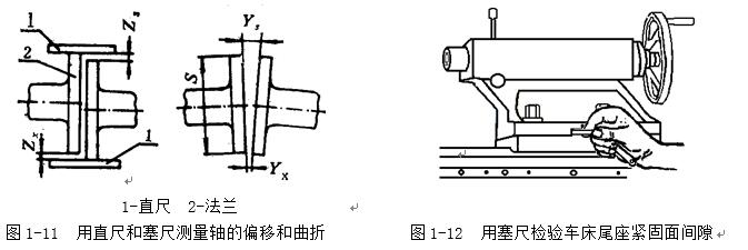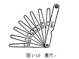 塞尺又稱厚薄規(guī)或間隙片。主要用來(lái)檢驗(yàn)機(jī)床特別緊固面和緊固面、活塞與氣缸、活塞環(huán)槽和活塞環(huán)、十字頭滑板和導(dǎo)板、進(jìn)排氣閥頂端和搖臂、齒輪嚙合間隙等兩個(gè)結(jié)合面之間的間隙大小。塞尺是由許多層厚薄不一的薄鋼片組成(圖1-10)按照塞尺的組別制成一把一把的塞尺,每把塞尺中的每片具有兩個(gè)平行的測(cè)量平面,且都有厚度標(biāo)記,以供組合使用。