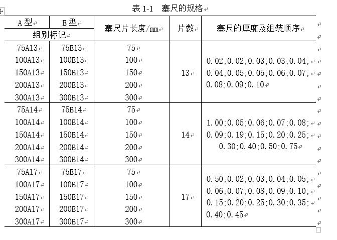 測(cè)量時(shí),根據(jù)結(jié)合面間隙的大小,用一片或數(shù)片重迭在一起塞進(jìn)間隙內(nèi)。例如用0.03mm的一片能插入間隙,而0.04mm的一片不能插入間隙,這說(shuō)明間隙在0.03~0.04mm之間,所以塞尺也是一種界限量規(guī)。塞尺的規(guī)格見表1-1。