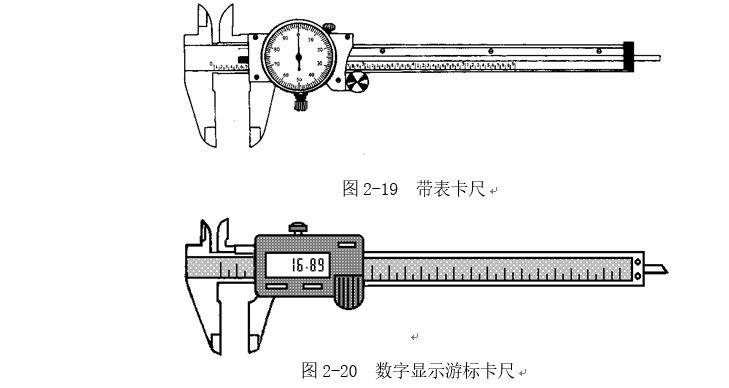 以上所介紹的各種游標卡尺都存在一個共同的問題,就是讀數(shù)不很清晰,容易讀錯,有時不得不借放大鏡將讀數(shù)部分放大。現(xiàn)有游標卡尺采用無視差結構,使游標刻線與主尺刻線處在同一平面上,消除了在讀數(shù)時因視線傾斜而產(chǎn)生的視差;有的卡尺裝有測微表成為帶表卡尺(圖2-19),便于讀數(shù)準確,提高了測量精度;更有一種帶有數(shù)字顯示裝置的游標卡尺(圖2-20),這種游標卡尺在零件表面上量得尺寸時,就直接用數(shù)字顯示出來,其使用極為方便。