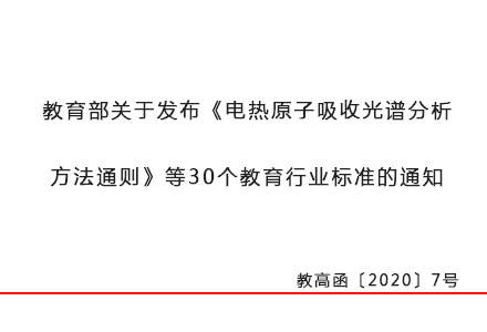 10月9日,教育部辦公廳印發(fā)“教育部關(guān)于發(fā)布《電熱原子吸收光譜分析 方法通則》等30個教育行業(yè)標(biāo)準(zhǔn)的通知 ”(下稱“通知”)。通知表示,經(jīng)全國教育裝備標(biāo)準(zhǔn)化技術(shù)委員會審查通過,現(xiàn)發(fā)布 30個教育行業(yè)標(biāo)準(zhǔn),并將自2020年12月1日起實施。