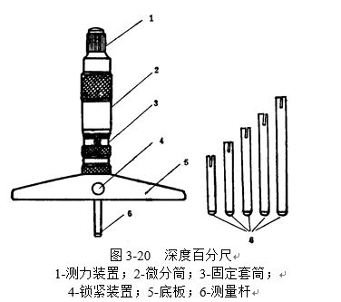 深度百分尺測(cè)量孔深時(shí),應(yīng)把基座5的測(cè)量面緊貼在被測(cè)孔的端面上。零件的這一端面應(yīng)與孔的中心線垂直,且應(yīng)當(dāng)光潔平整,使深度百分尺的測(cè)量桿與被測(cè)孔的中心線平行,保證測(cè)量精度。此時(shí),測(cè)量桿端面到基座端面的距離,就是孔的深度。