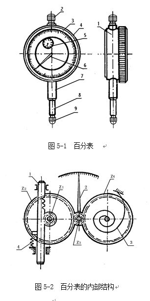 圖5-2是百分表內(nèi)部機(jī)構(gòu)的示意圖。帶有齒條的測量桿1的直線移動,通過齒輪傳動(Z1 、Z2 、 Z3),轉(zhuǎn)變?yōu)橹羔?的回轉(zhuǎn)運(yùn)動。齒輪Z4和彈簧3使齒輪傳動的間隙始終在一個方向,起著穩(wěn)定指針位置的作用。彈簧4是控制百分表的測量壓力的。百分表內(nèi)的齒輪傳動機(jī)構(gòu),使測量桿直線移動1mm時,指針正好回轉(zhuǎn)一圈。