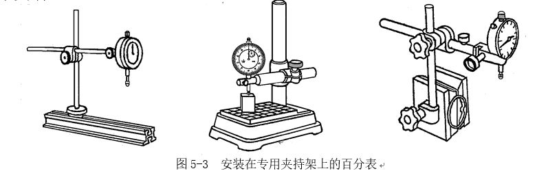 2 使用百分表或千分表時(shí),必須把它固定在可靠的夾持架上(如固定在萬(wàn)能表架或磁性表座上,圖5-3所示),夾持架要安放平穩(wěn),免使測(cè)量結(jié)果不準(zhǔn)確或摔壞百分表。
