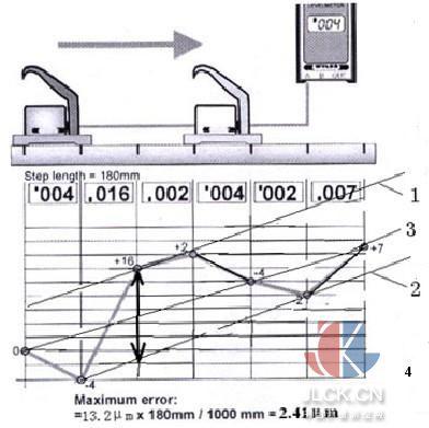 利用數(shù)顯式電子水平儀逐檔測量導(dǎo)軌的直線度,步距l(xiāng)有150mm, 180mm,200mm等。第一檔0-l,第二檔l-2l;并逐檔將讀數(shù)記錄下來。但取數(shù)后,進行計算或作坐標(biāo)圖時,各類專業(yè)書上所采用的方法差別較大,常用的為作圖法和計算法。