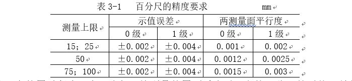 百分尺是一種應(yīng)用很廣的精密量具,按它的制造精度,可分0級(jí)和1級(jí)的兩種,0級(jí)精度較高,1級(jí)次之。百分尺的制造精度,主要由它的示值誤差和測(cè)砧面的平面平行度公差的大小來(lái)決定,小尺寸百分尺的精度要求,見(jiàn)表3-1。從百分尺的精度要求可知,用百分尺測(cè)量IT6~I(xiàn)T10級(jí)精度的零件尺寸較為合適。